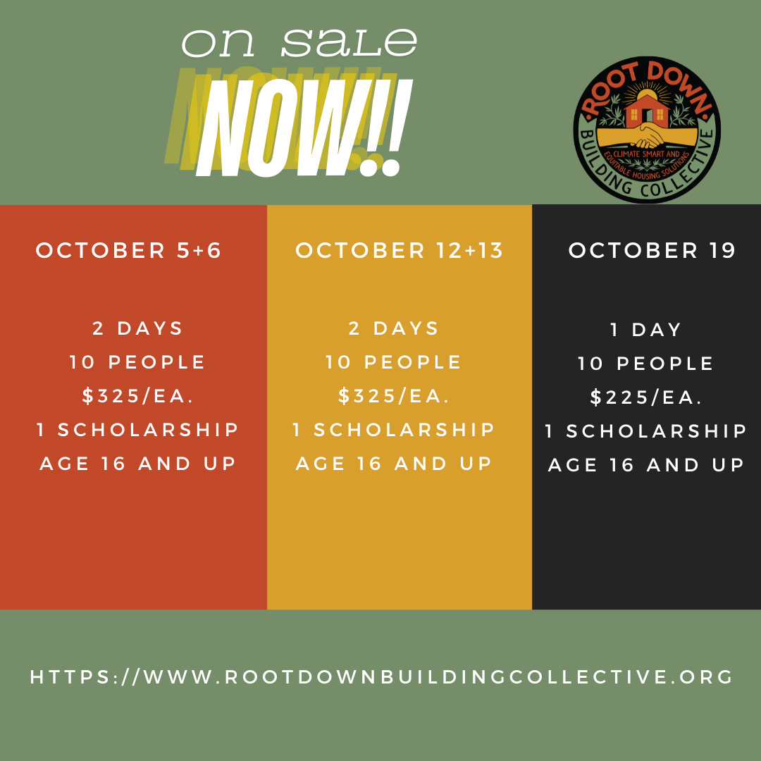 INSTRUCTORS: These workshops will be taught by April Magill + several of our trained RDBC team members. April is an Architect, and the Founder/director of the Root Down Building Collective. She has been teaching natural building workshops for over a decade. She is also an Adjunct Professor at the American college of Building Arts, and is the Region 10 co-lead for the US Hemp Building Association (USHBA).
