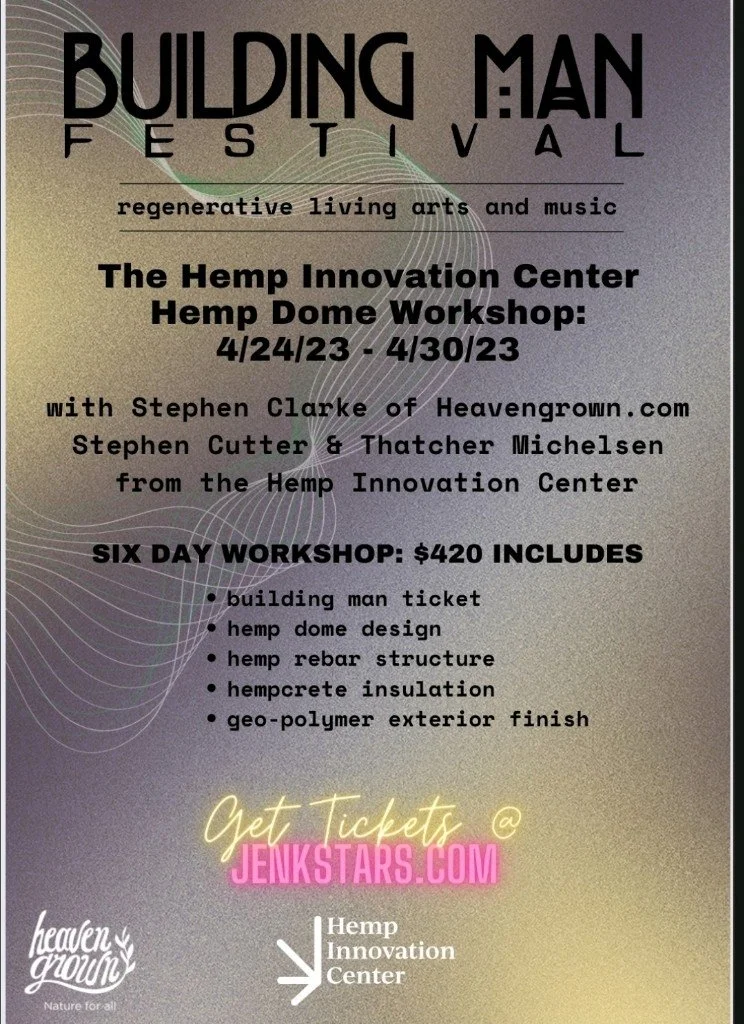 THIS YEAR WE WILL ARE BRINGING THE WORLDS HEMP EXPERTS TO THE RANCH AND BUILDING A DOME ENTIRELY FROM HEMP AND HEMP PRODUCTS. THIS 6 DAY WORKSHOP STARTS APRIL 24 2023 AND GOES THROUGH THE FESTIVAL AND ENDS ON SUNDAY APRIL 30. TICKETS TO THE 6 DAY WORKSHOP CAN BE PURCHASED HERE AND INCLUDE YOUR BUILDINGMAN TICKET.