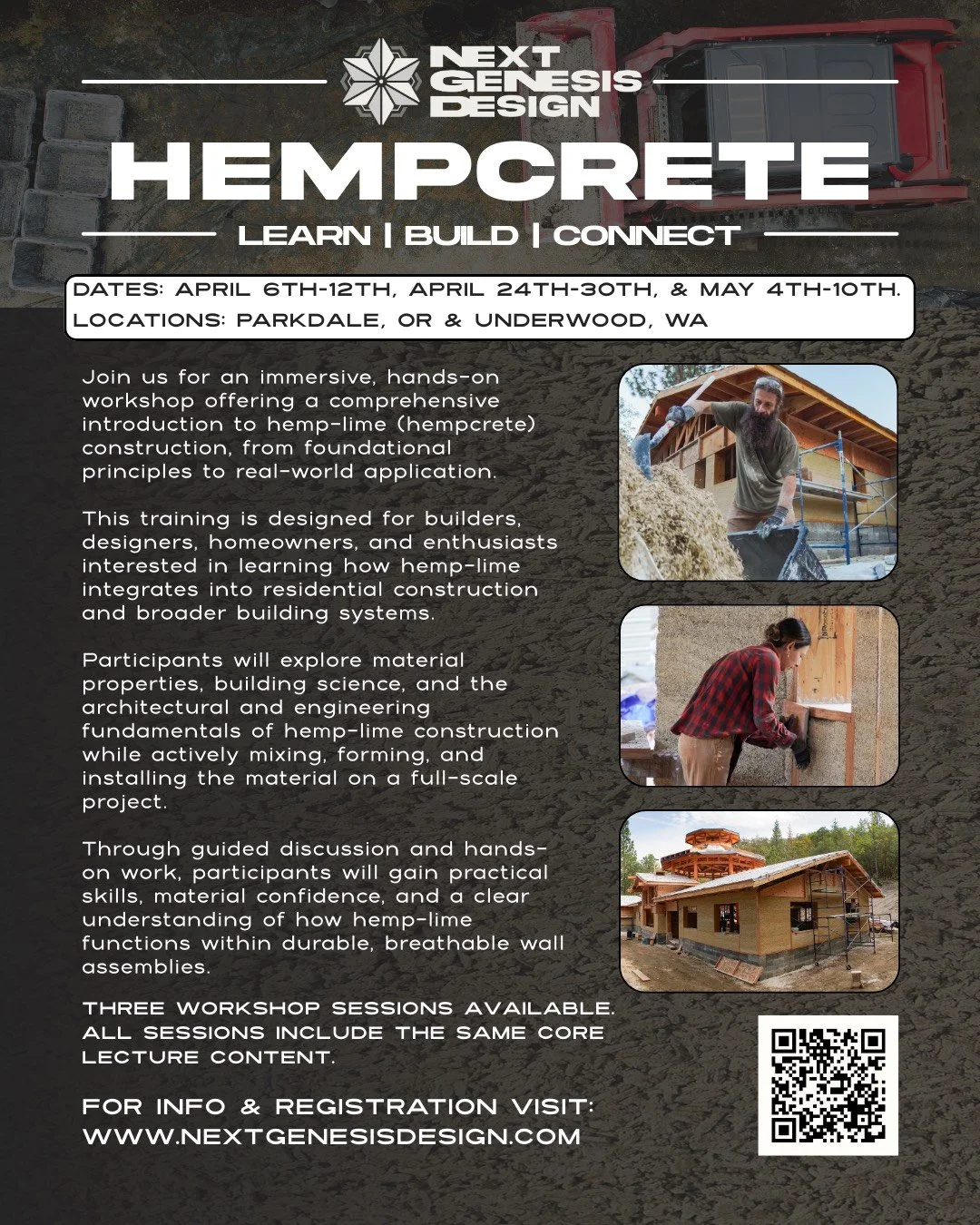 Description: Participants will gain a comprehensive understanding of hemp-lime construction. Topics include an in depth analysis of the design and engineering of wall assemblies, formwork setup, mixing protocols, tamping techniques, curing behavior, moisture management, and how hemp-lime integrates with various framing systems. This training takes place within an active build, providing real-world exposure to sequencing, site logistics, and material handling.