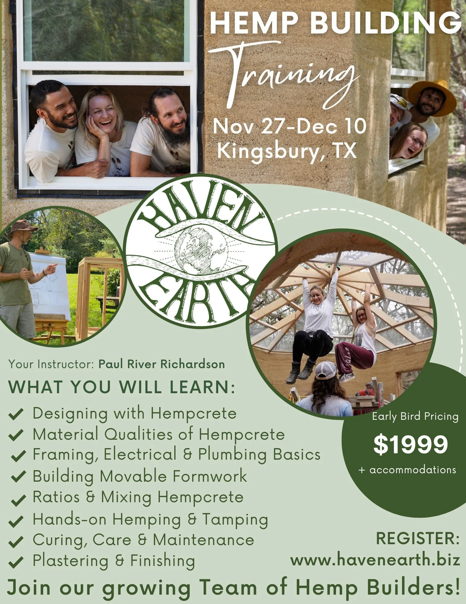 We are so excited to build the first of our Hemp Modular Home System at our Haven Earth Texas Campus location which will be the home of the New Earth Trade School! Come have fun, learn a lot and become one of our certified builders to help us build out 100 + more hemp homes around the country!