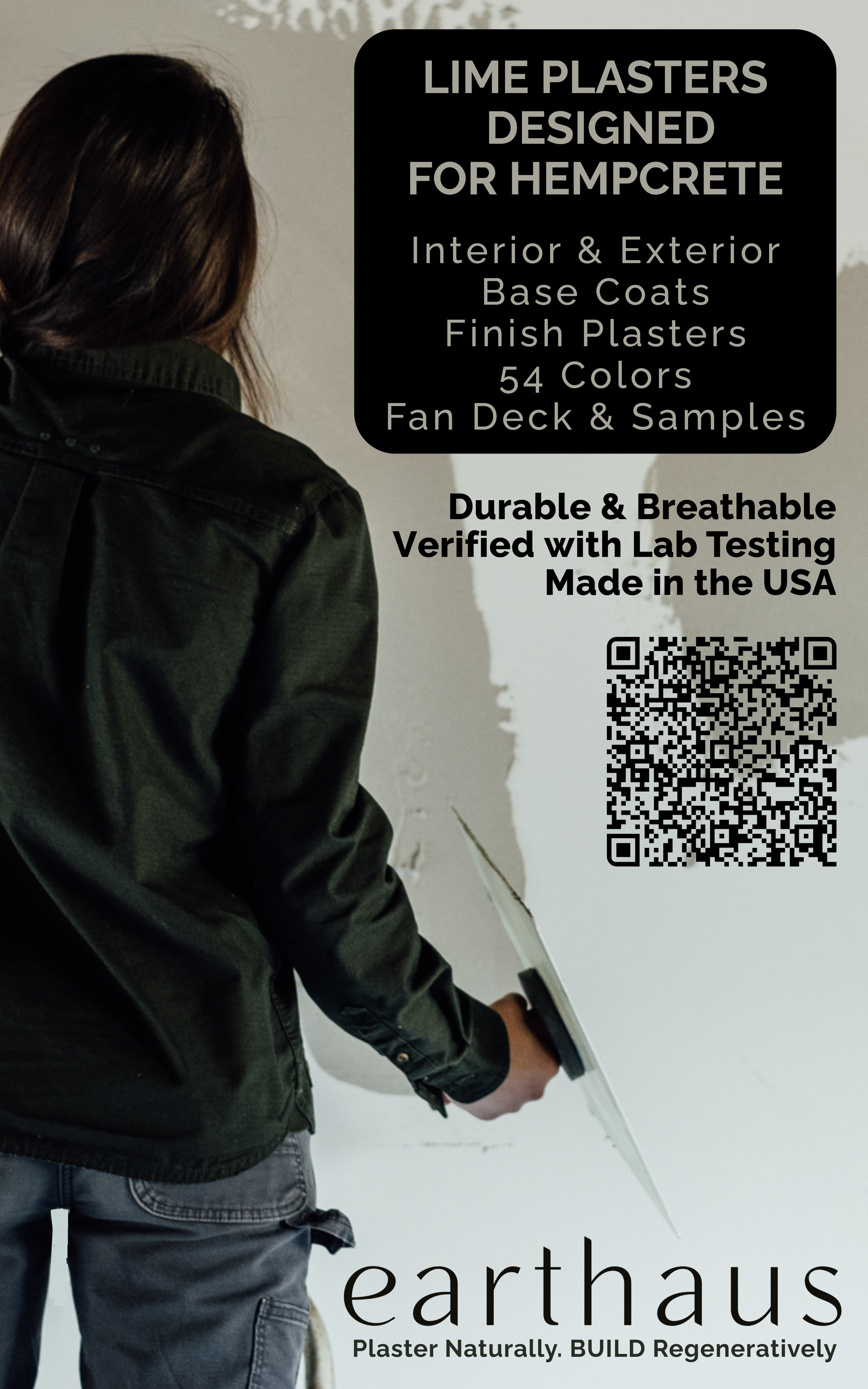 After 25 years in natural building, the biggest challenge I see is the lack of standardized materials and systems. For hemp and other bio-based methods to gain wider acceptance among mainstream builders and code officials, we need consistency and clear standards just like in conventional construction. That’s what we set out to achieve with Earthaus BUILD: standardized interior and exterior lime plaster systems for biobased and earthen construction. Our BUILD Plaster System for hempcrete is suitable for cast, block, spray, and panel applications. Each Earthaus Plaster is expertly formulated and precisely mass manufactured, available at scale, and supported with standardized mineral pigment colors, finish options, and technical documentation to ensure success from installation through long-term performance.