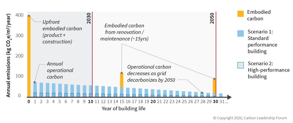 Research from the Carbon Leadership Forum shows that some common building materials, such as concrete or mineral wool insulation, are manufactured or installed with such toxic processes that no matter how much “operational carbon” they fail to emit, the numbers are overwhelmed by the upfront embodied carbon. Furthermore, more embodied carbon is added to the building’s footprint when it is renovated, or torn down, when materials are dumped in a landfill.