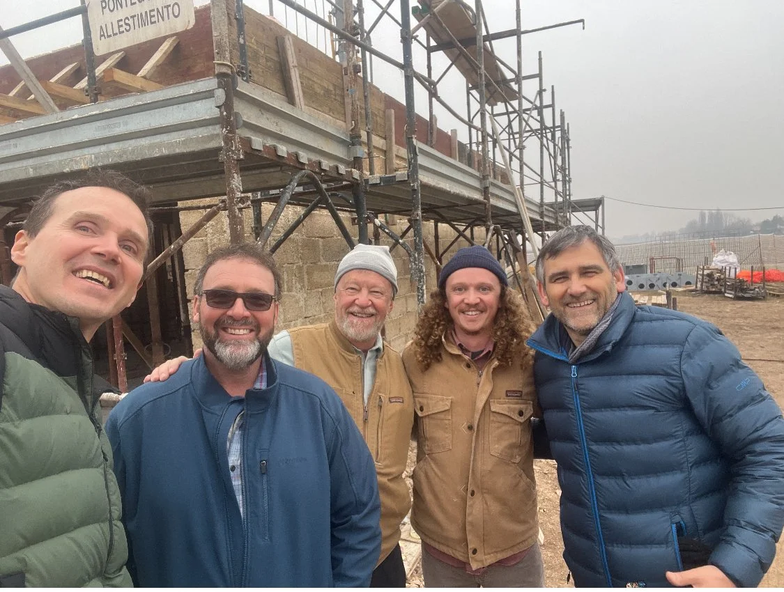 The Hemp Building Company team traveled to Italy in February to see hemp block structures and tour the Senini-Tecnocanapa factory. L-R Paolo Ronchetti, Dom Blanch, Bob Dalton, Phelan Dalton, unidentified contractor. Photo courtesy of Phelan Dalton