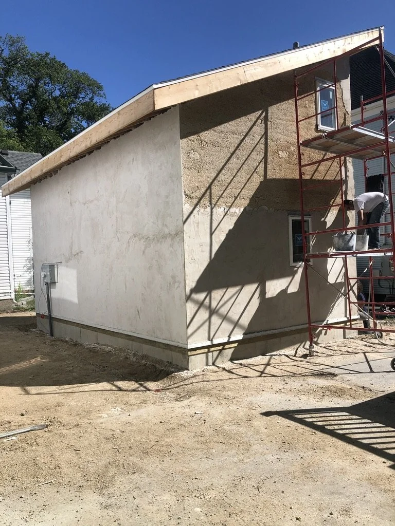 The outer walls of the hempcrete demonstration house are plastered at the Hive, in Fargo, ND. Courtesy of Grassroots Development