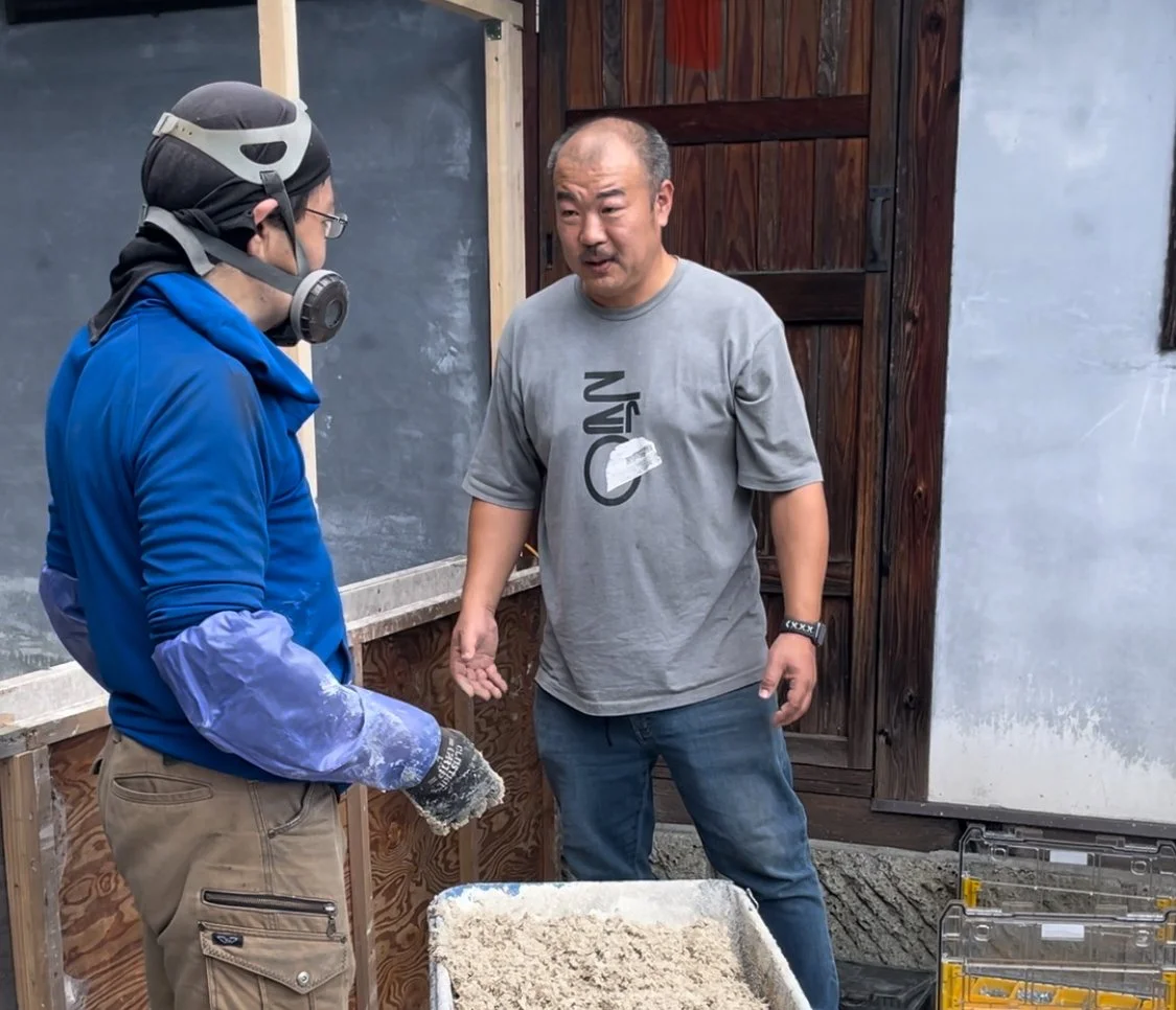 Yoshinori Oomuri, (R), owner of Golden Hemp speaks to an employee at a hempcrete workshop in Tochigi. Photo by Jean Lotus