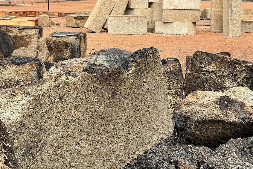 Cured hemp blocks (background) at Hemp Squared in Bridgetown, West Australia survived a bushfire Feb. 5, 2022 that destroyed the factory and blocks that were partially cured (foreground). Photo courtesy of Hemp Squared Pty. Ltd.