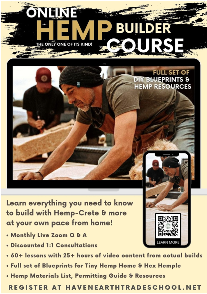 The course is for anyone with a good understanding of construction, or contractors with solid building experience. Students have lifetime access and can start at any time and go at their own pace. It includes two sets of blueprint builds, monthly live Q & A group sessions, Hemp resources as well as ongoing content from other build projects that will contnually be added. Our hope with the course is that more builders and aspiring designers will feel confident to step into the healthy hemp home building space and take this nature-based system into the mainstream. The Haven Earth Online Hemp Builder Course is now live and accepting students. Learn more here: https://www.havenearthtradeschool.net/hemp-building-course/lfsh6