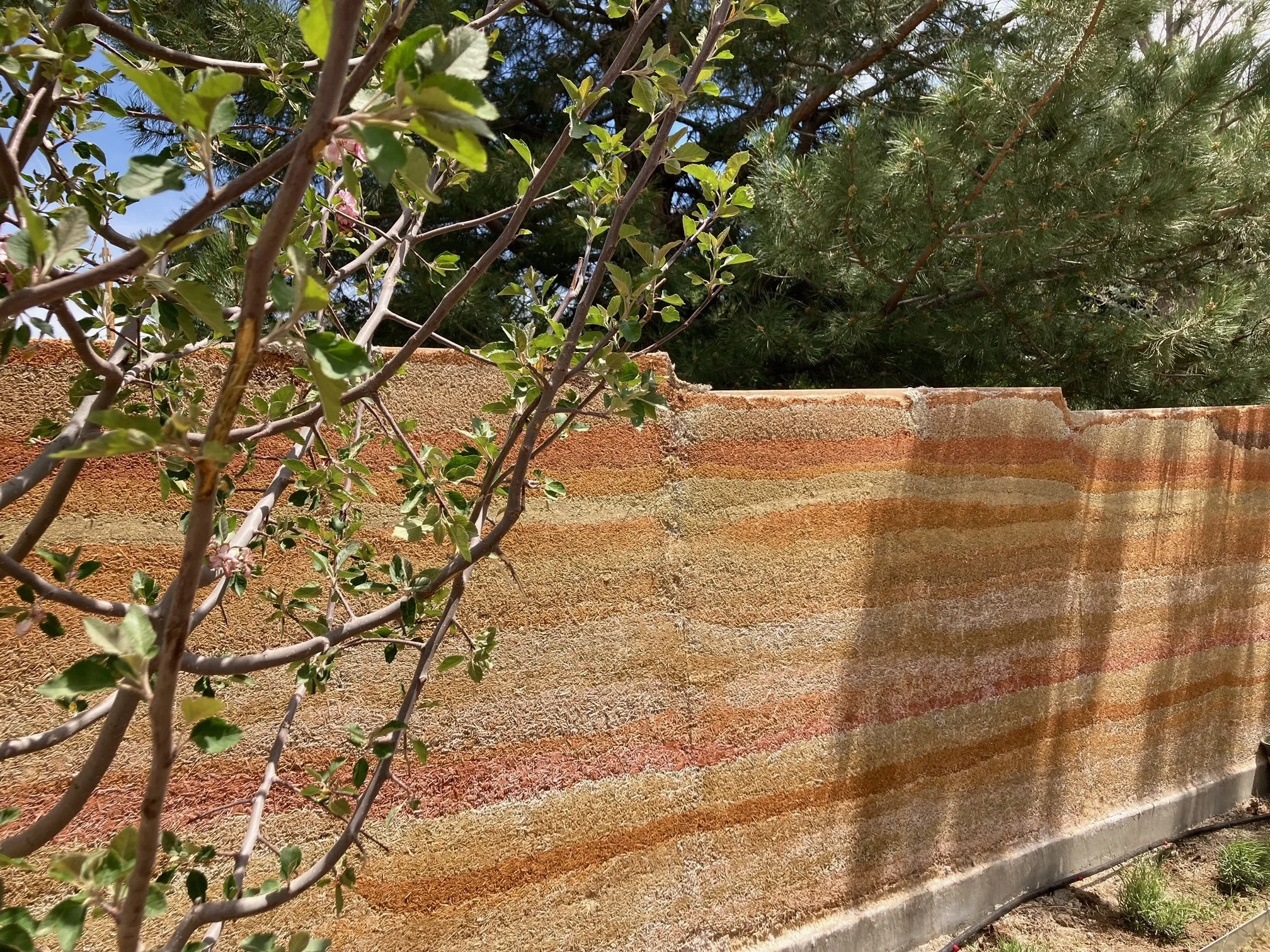 A hempcrete privacy wall with stratified pigments was constructed this month in Boulder by a team of volunteers at a cohousing development on the city’s north side. Photo by Scott Rodwin
