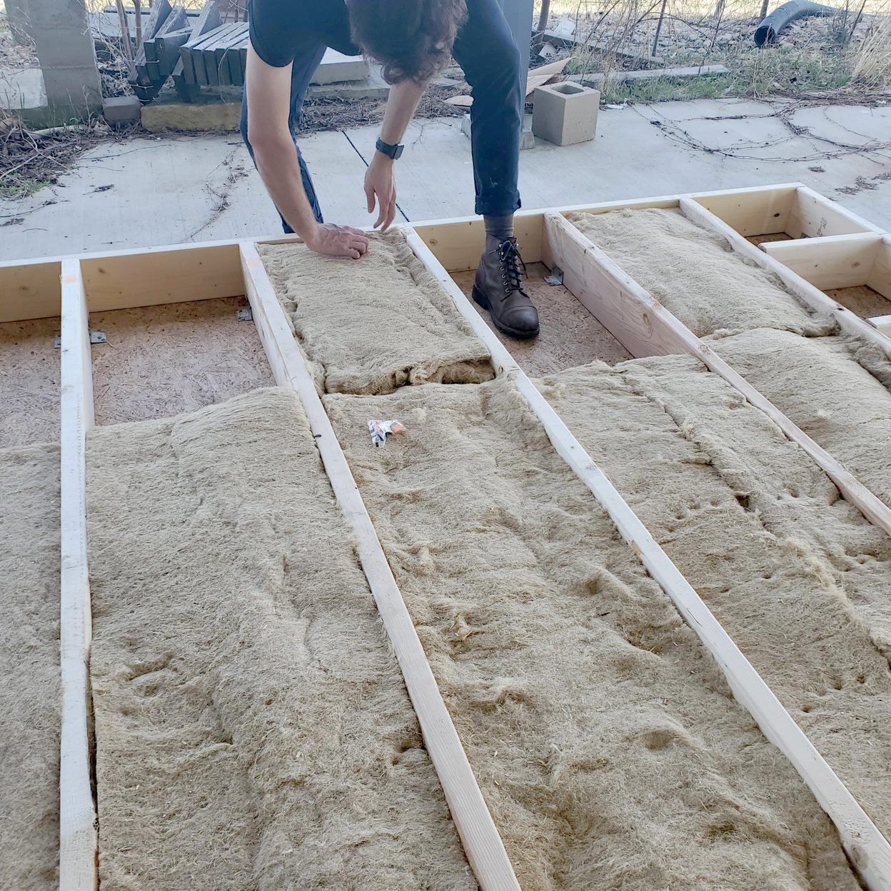 A student applies HempWool batt insulation to the walls of the K-State Hemp Casita.. Photo courtesy of Michael Gibson