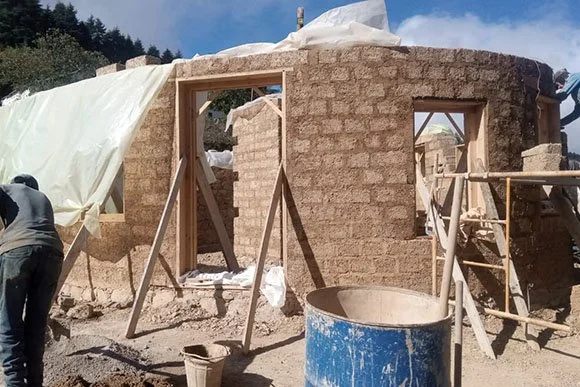 A crowdfunded rural cottage created with Cannabric hand crafted hemp blocks is being built in rural Morocco. Photo courtesy of CannabricCannatektum and Coopérative Adrar Nouh.