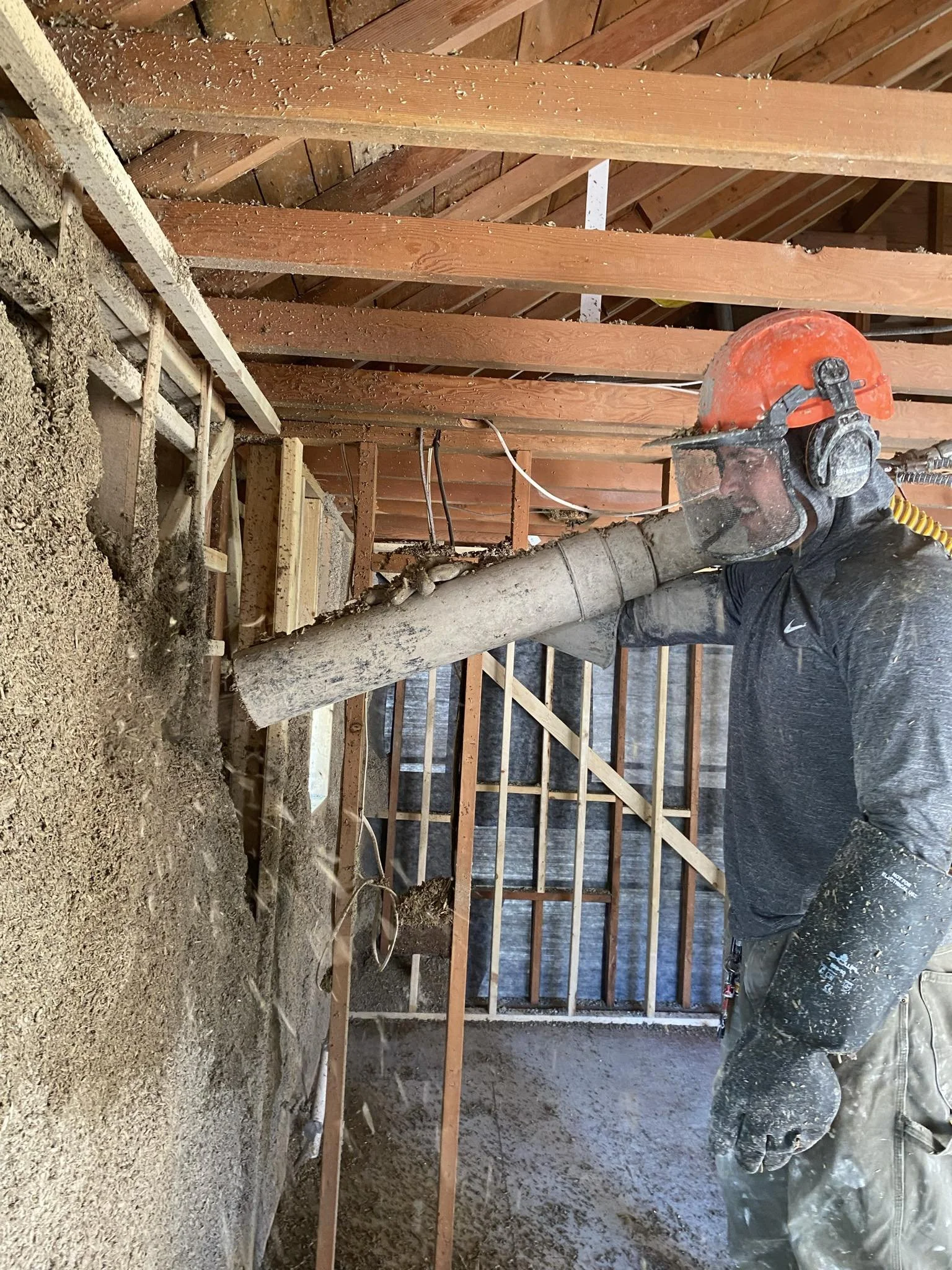 Hemp lime (hempcrete) is sprayed into the wall cavities of the gutted house on the Lower Sioux Reservation. Photo courtesy of Danny Desjarlais