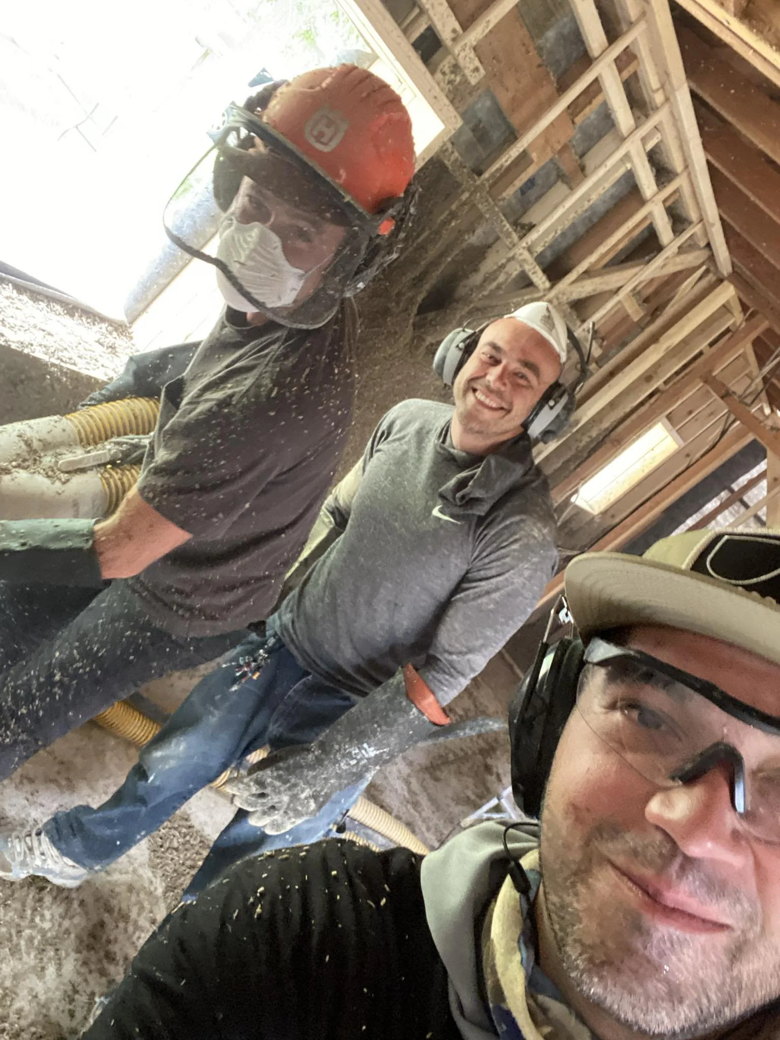 [L-R} Joel Caldwell, Jesse Berry and Danny Desjarlais install hemp-lime (hempcrete) in a Lower Sioux reservation retrofit project. Photo courtesy of Danny Desjarlais