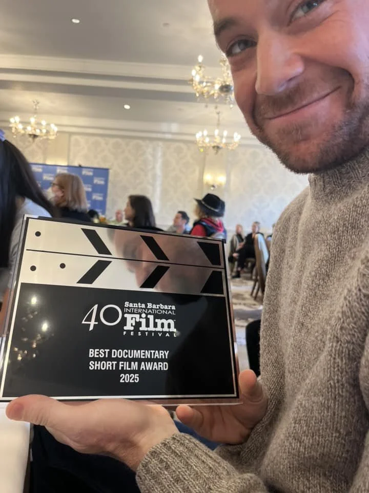 Documentary director Joel Caldwell shows off his award plaque at the Santa Barbara International Film Festival. Photo courtesy of Danny Desjarlais