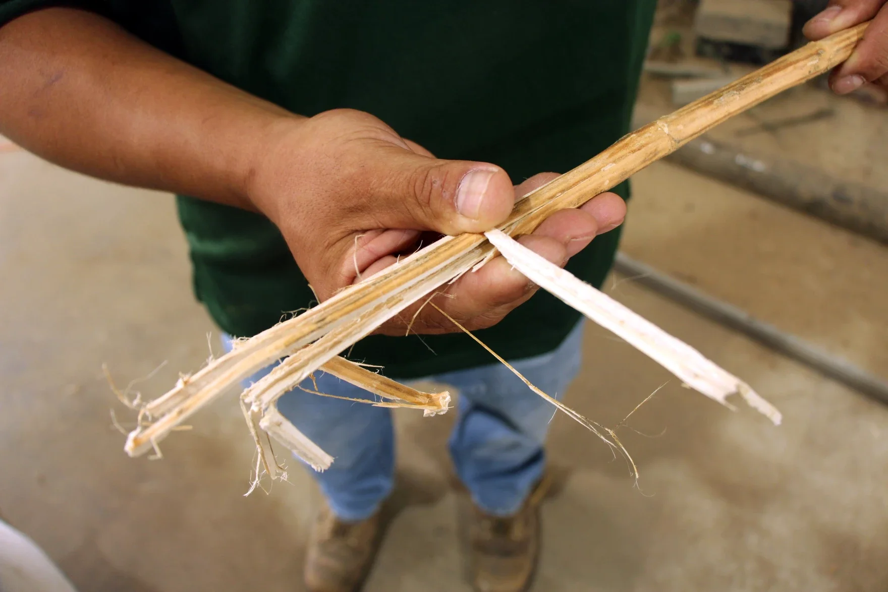Jonathan Melchior, lead operator at Prairie Band Ag, holds up a hemp stalk at Prairie Band Ag. Its pithy inside, called hurd, can be chopped in pieces and used in hempcrete. The long fibers of the stalk’s outside layer, called bast, can be used to make batts that look a bit like fiberglass insulation. Courtesy of Celia Llopis-Jepsen/Kansas News Service