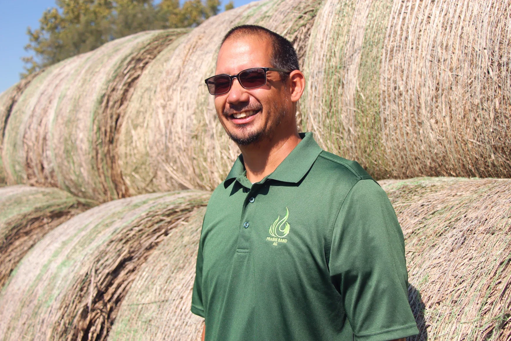 Jonathan Melchior, of Prairie Band Ag, poses in front of bales of hemp at the company’s site on the Prairie Band Potawatomi Reservation north of Topeka. The tribally owned company grew and processed the hemp used in the Ogden house. Photo courtesy of Celia Llopis-Jepsen/Kansas News Service