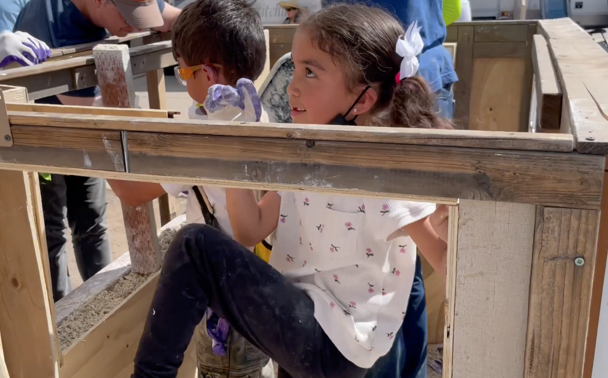 Children participating in the hemp insulation of a playhouse at the Tucson Hemp Fiesta. Photo courtesy Jean Lotus