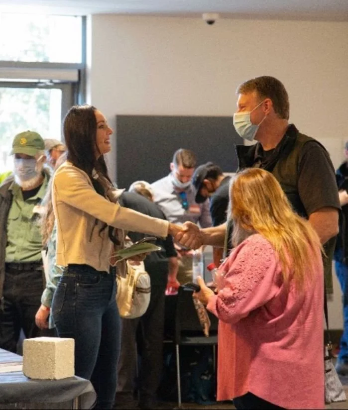 Melissa Nelson of South Bend Industrial Hemp shakes hands with Ray Kaderli while socializing at the U.S. Hemp Building Summit held in Austin, TX Oct. 29-30. Photo courtesy of Melissa Nelson
